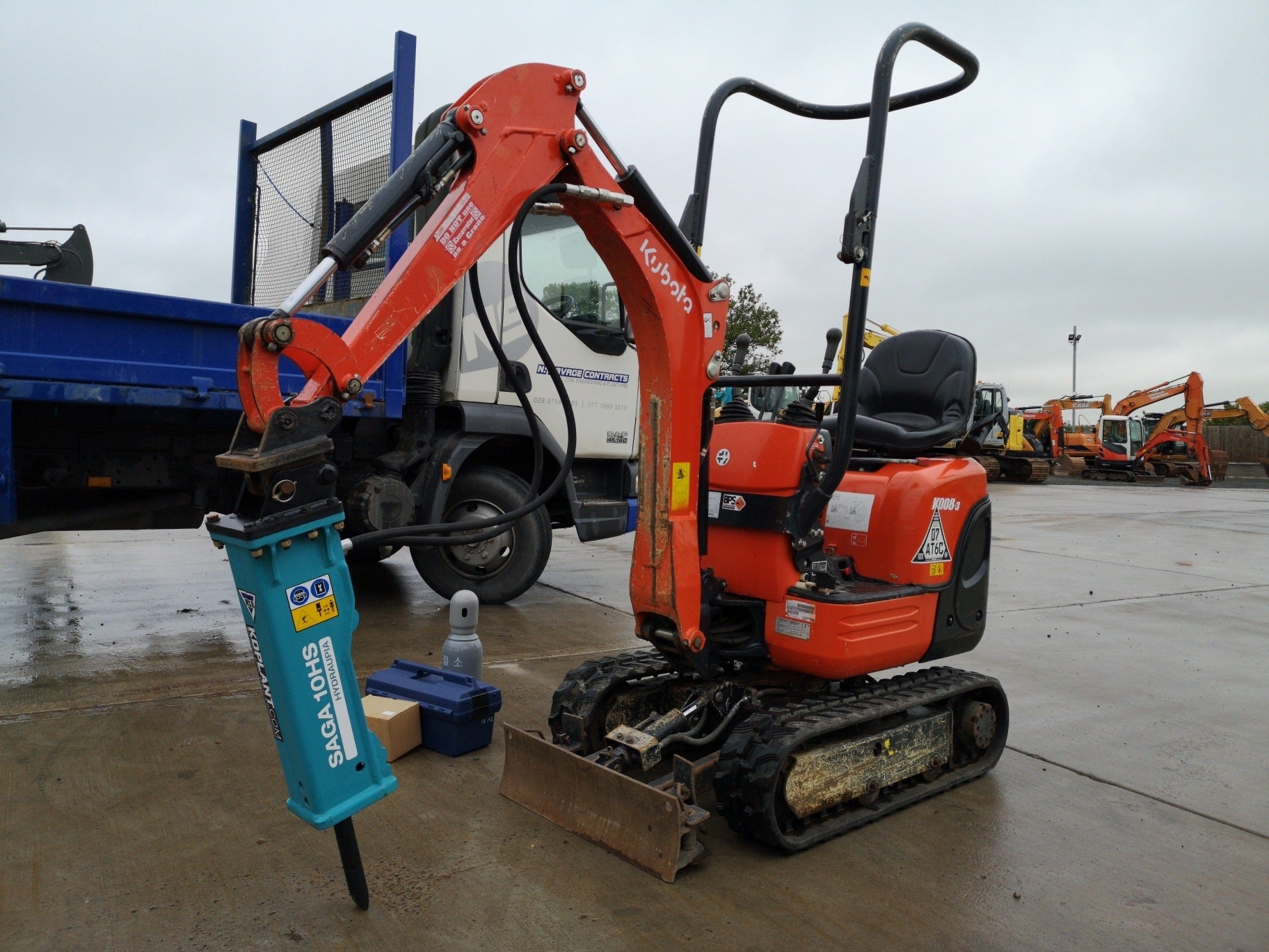 Brand new SAGA 10HS gas fired rock breaker by MSB for 0.8-1.2 ton hydraulic excavators. Comes with custom head bracket to suit your machine, hoses, spare chisel, and gas recharge / maintenance kit.